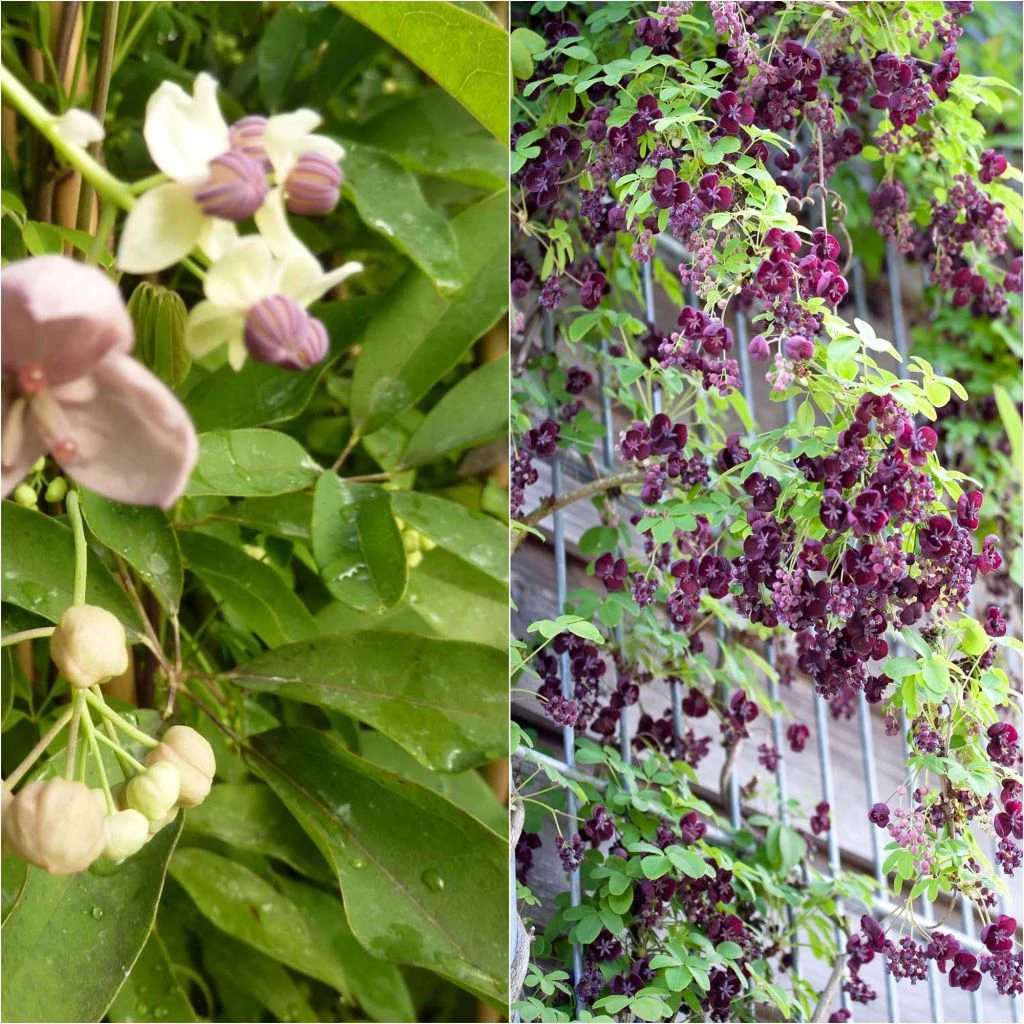 Facile à cultiver et peu exigeante, l’Akebia quinata comme l’hybride Akebia x pentaphylla offrent une floraison généreuse et précoce, d’avril à mai. Les multiples fleurs au parfum vanillé, naissant en clochettes originales, s’ouvrent largement et laissent apparaître une teinte rose foncé allant du violet pourpré au lie de vin en passant par le blanc crème.